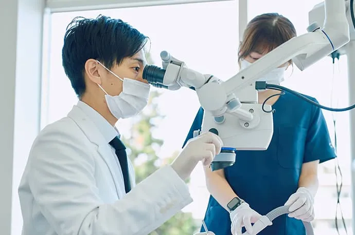 マイクロスコープは、肉眼では確認できない細部まで拡大して観察できる機器です。根管治療や精密な処置において、治療精度を高めるために使用します。