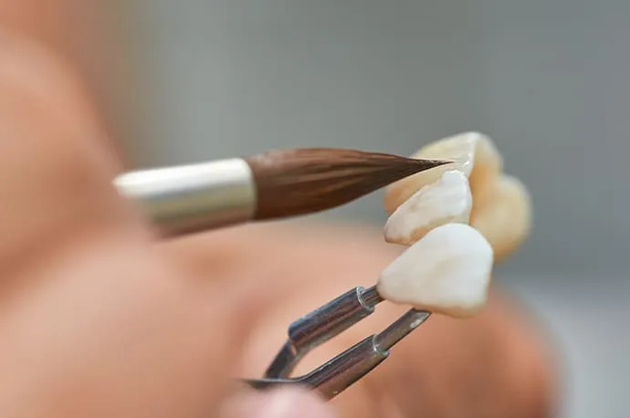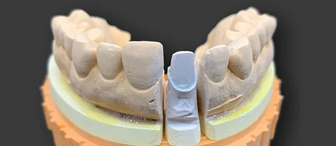 模型上でセラミックを何層にも分けて焼き付けていきます。層を重ねることで、より繊細で自然な色調の再現が可能になります。患者さまのお口の写真を参考にしながら、細かな色味を調整します。
