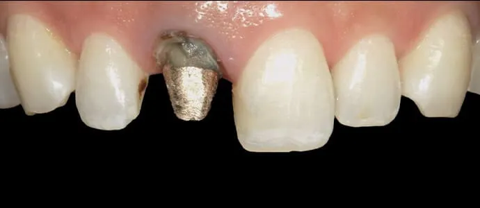 過去に治療した右上前歯のセラミックが、周囲の歯と色調が合っていない状態です。