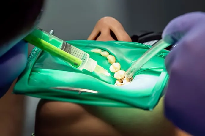 ラバーダムとは、根管治療の際に治療する歯だけを露出させ、周囲をゴム製のシートで覆う器具です。唾液や細菌が治療部位に入り込むのを防ぎ、根管内を清潔な状態に保つことで、治療の成功率を高めます。また、薬剤や器具の誤飲を防ぐ安全面のメリットもあります。精密さが求められる根管治療において、ラバーダムは重要な役割を果たします。