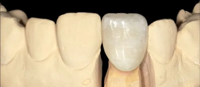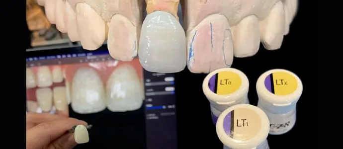 模型上でセラミックを何層にも分けて焼き付けていきます。層を重ねることで、より繊細で自然な色調の再現が可能になります。患者さまのお口の写真を参考にしながら、細かな色味を調整します。