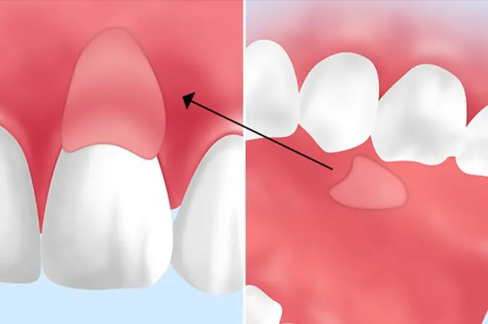 歯肉移植では、ご自身のお口の中(主に上あご)から健康な歯ぐきを採取し、下がってしまった部分に移植します。ご自身の組織を使用することで、自然で安定した歯ぐきの回復を目指します。