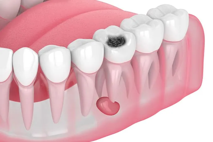 歯の神経がすでに死んでしまい、根管内で細菌が増殖している状態です。多くの場合、歯の根の先で化膿が起こっています(根尖性歯周炎)。