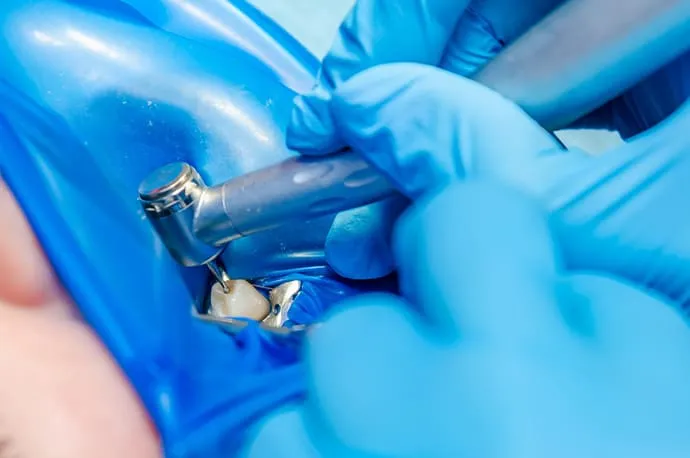 ラバーダムとは、根管治療の際に治療する歯だけを露出させ、周囲をゴム製のシートで覆う器具です。唾液や細菌が治療部位に入り込むのを防ぎ、根管内を清潔な状態に保つことで、治療の成功率を高めます。また、薬剤や器具の誤飲を防ぐ安全面のメリットもあります。精密さが求められる根管治療において、ラバーダムは重要な役割を果たします。
